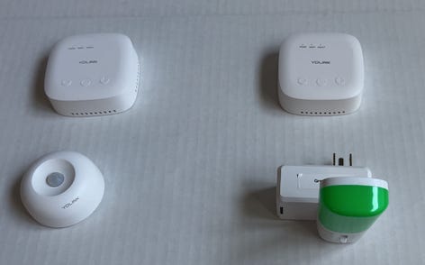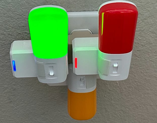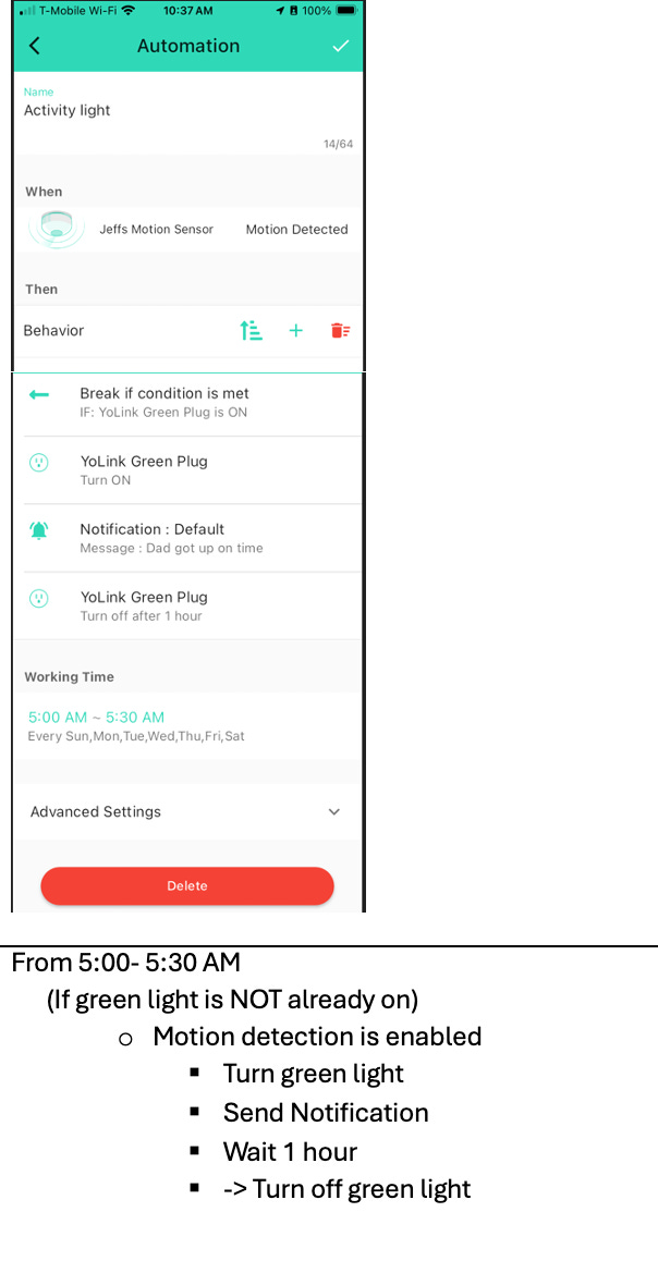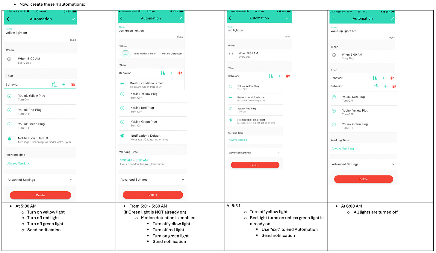 This solution builds on the simple solution by adding two more smart plugs at your home. They show yellow, green, and red lights based on your dad's morning wakeup status using additional YoLink Automations at your home. This gives you a “Traffic Light” indication that the system is checking (yellow), dad got upon time (green), or dad failed to get up on time (red)
