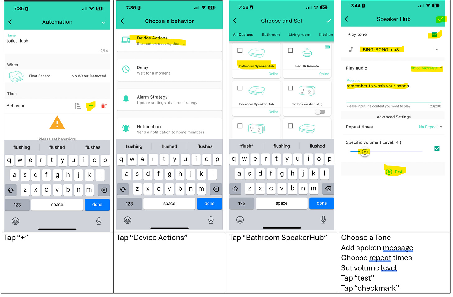 The YoLink automation will now speak the reminder to wash hands after each time the toilet is flushed. This works even if the toilet is manually flushed.