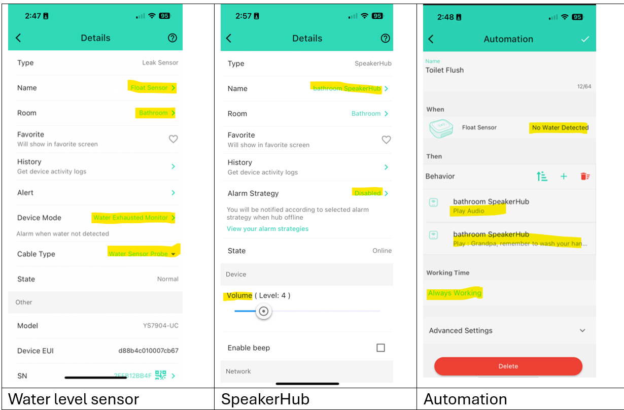 Once you have this running, if you are looking for a way to remind family members to wash their hands after toilet use, I have a simple < $70 solution that uses a YoLink water float level sensor to trigger a YoLink Speaker hub to speak a “Don’t forget to wash your hands” reminder.