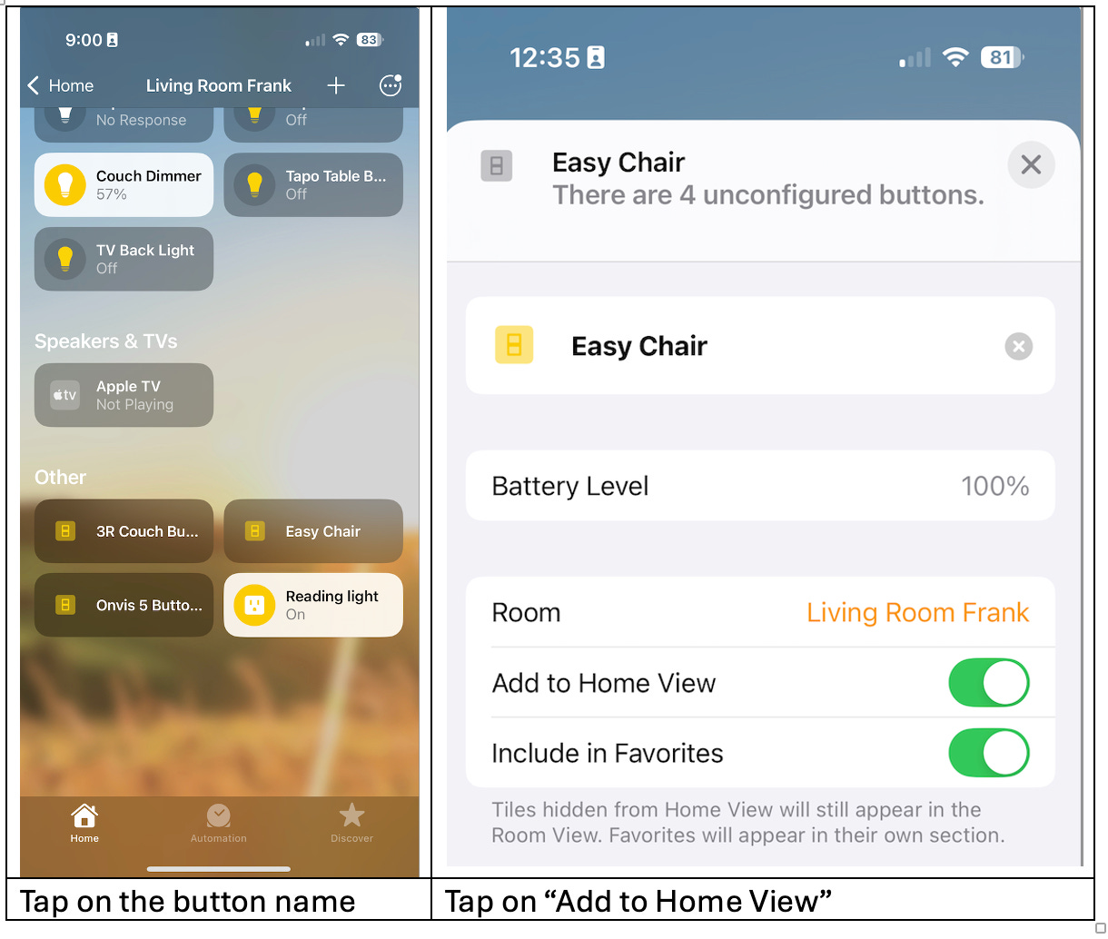 Note: If you are wondering where in Apple Home is that button you just added, tap on the room name and scroll down to “Other”. You may want to make this available in the Home View as follows:
