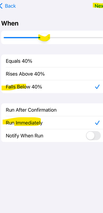 · Create the Automation that is triggered by a low battery level (setting level is your choice)
