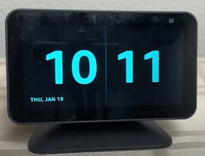 I'll start with the Echo Show 5, designed to be a bedside or tabletop clock, but I'm also demoing similar changes that can be made on an Echo Show 8, Echo Show 10, or Echo Show 15. No AM/PM display exists, but a 24-hour clock is available.