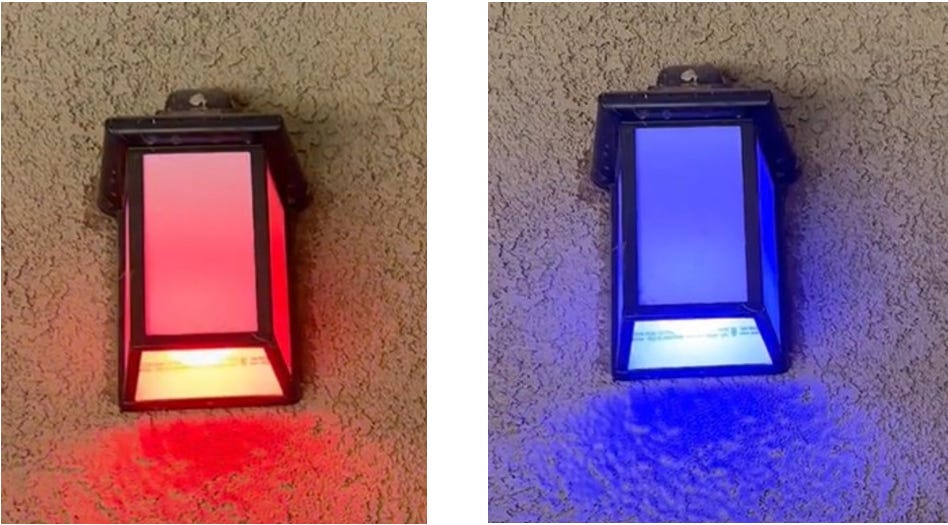 A smart bulb in your porch light that flashes Red & Blue may help the emergency crew locate you faster. Using the sample Alexa Routines below, this same smart bulb can function as a normal dusk-to-dawn light.